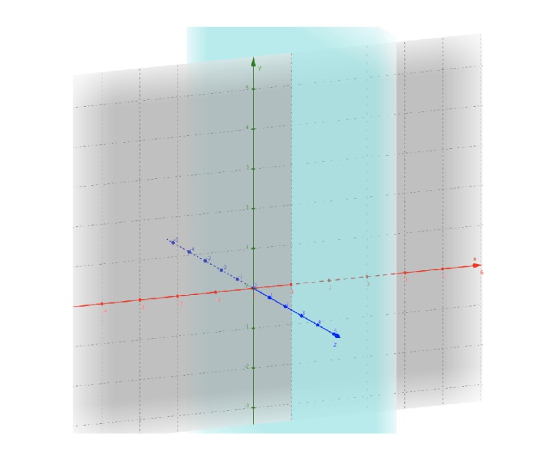 - 軸が3つ(x軸とy軸とz軸)の世界では、x=1は立体空間の中の平面になる(x=1、y=全ての数、z=全ての数)